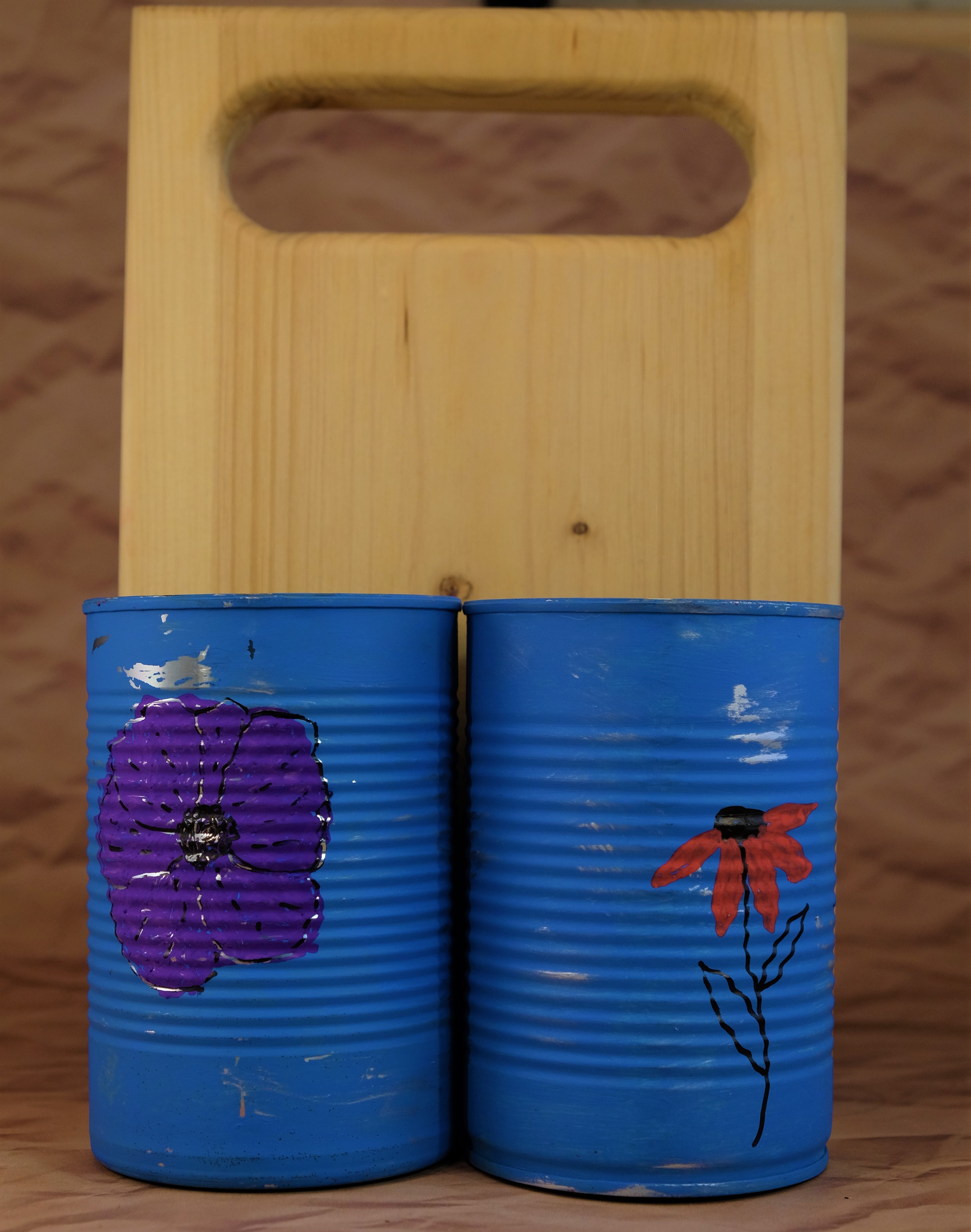 Der Besteckhalter ist aus Konservendosen gebastelt und der Tragegriff aus Holz.