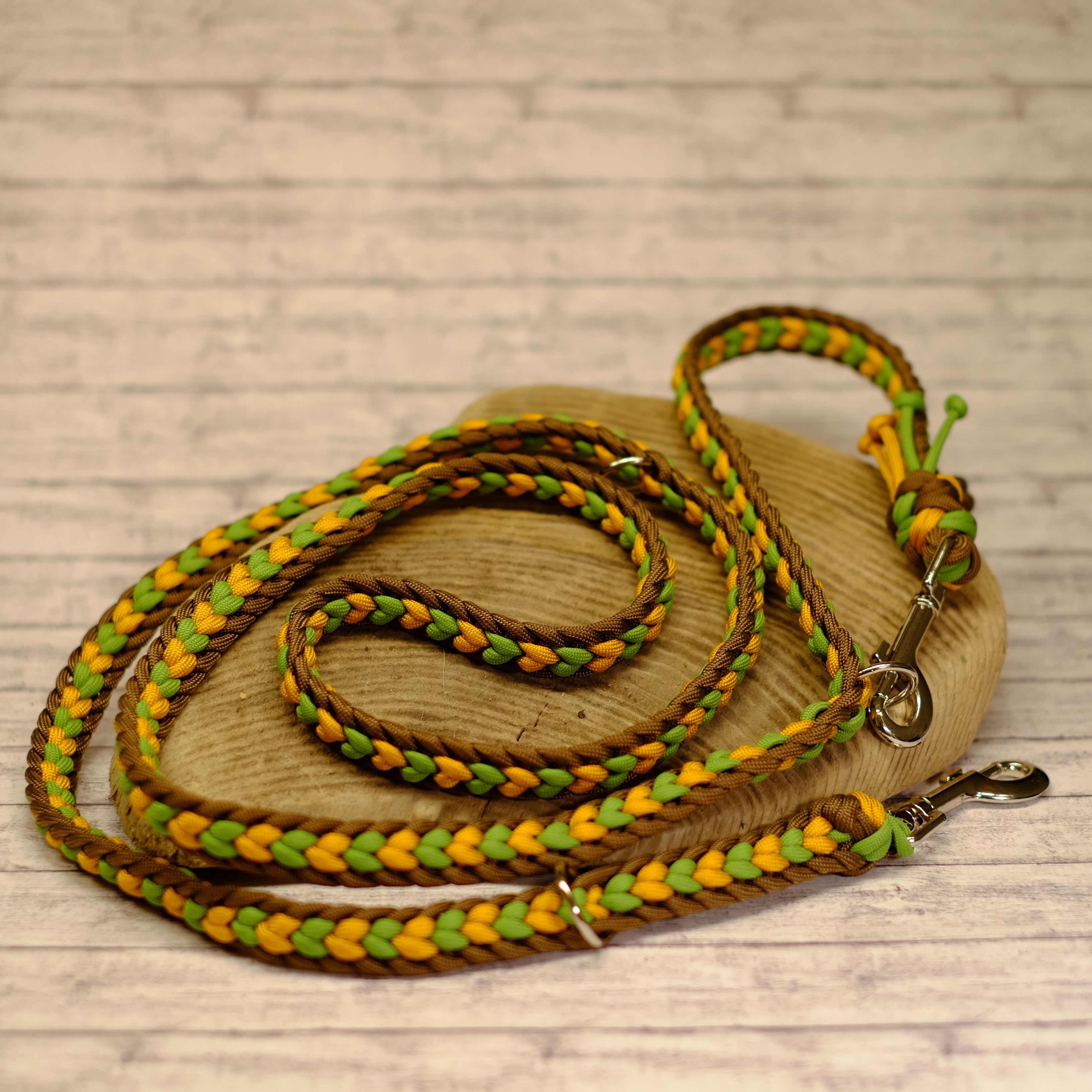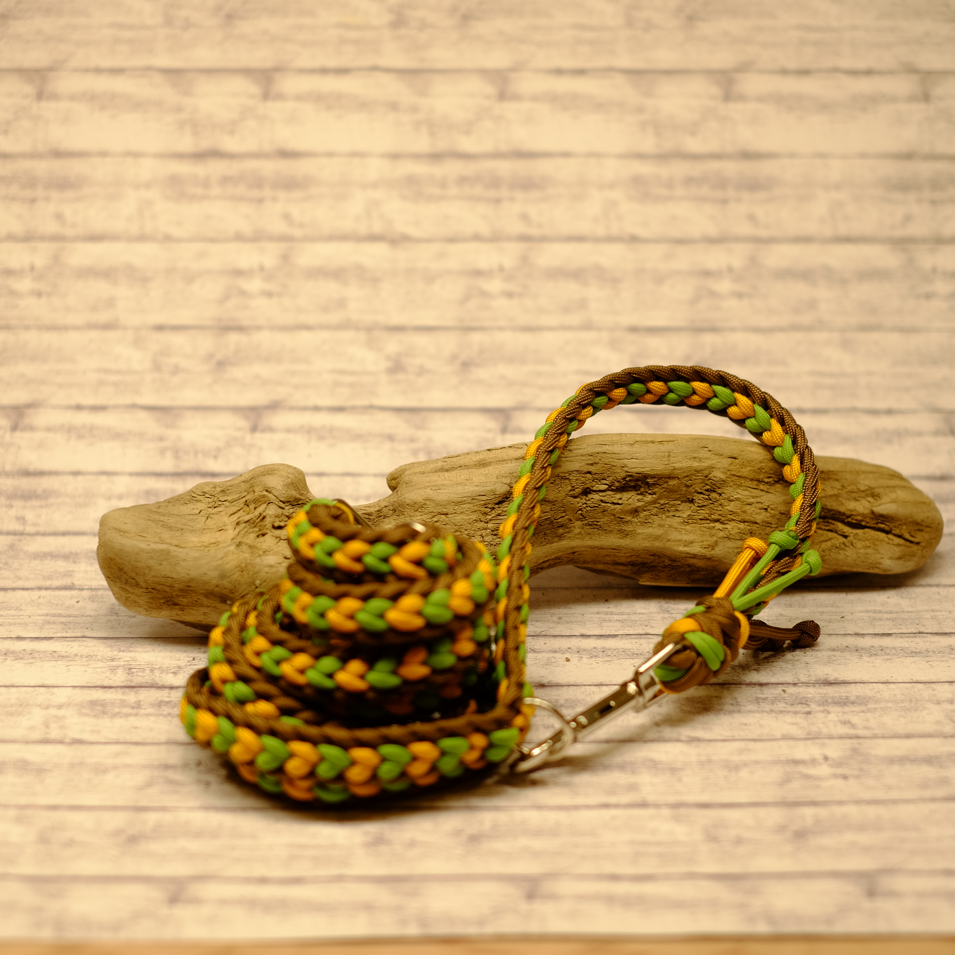 Die Hundeleine "Pocahontas" ist mit Herzmuster in den Farben, grün, braun und orange geknüpft. Liegt gut in der Hand und kann über drei Ringe in der Länge verstellt werden.
