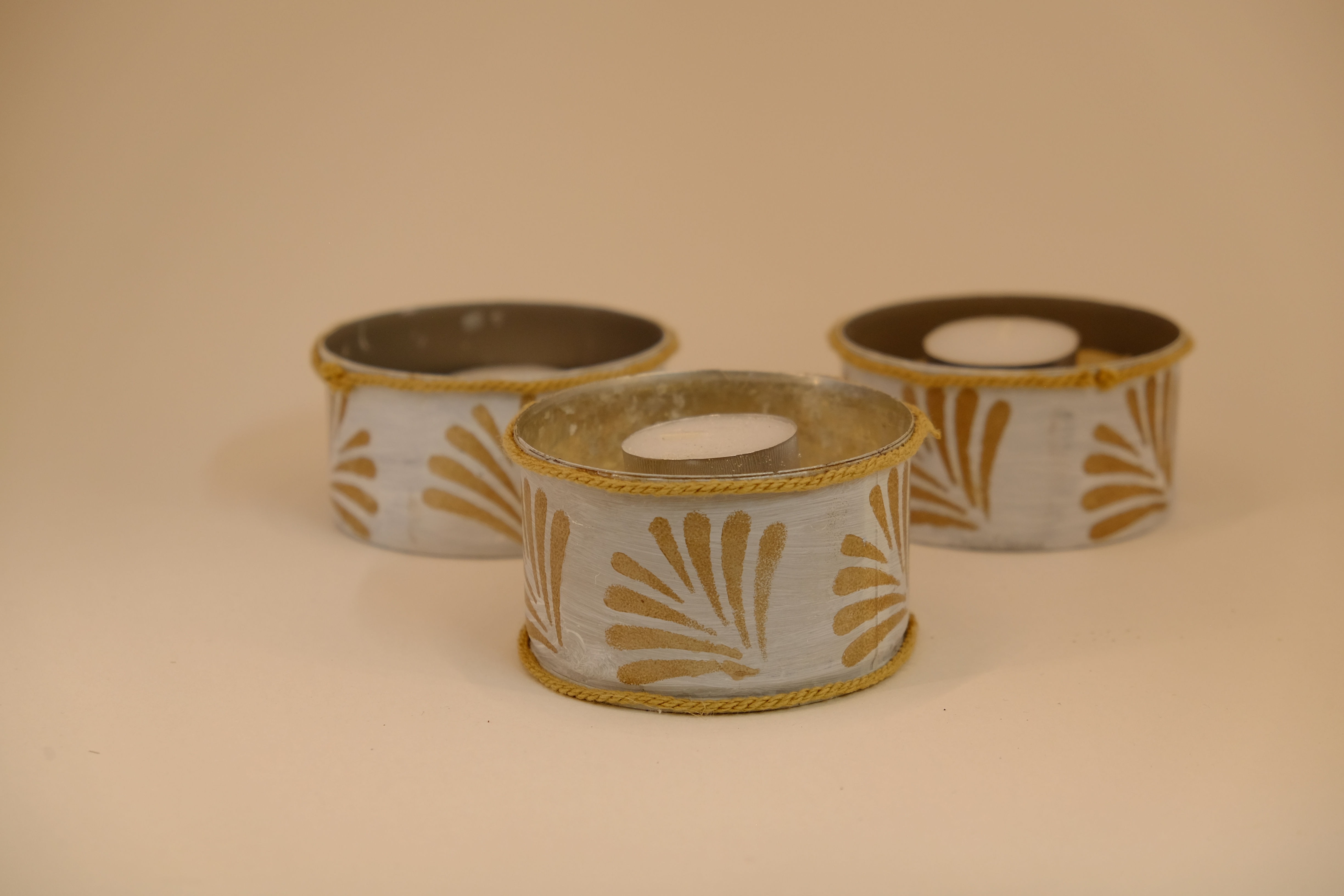 Das Windlicht besteht aus einer alten Thunfischdose. Sand und Kerze wird mitgeliefert.