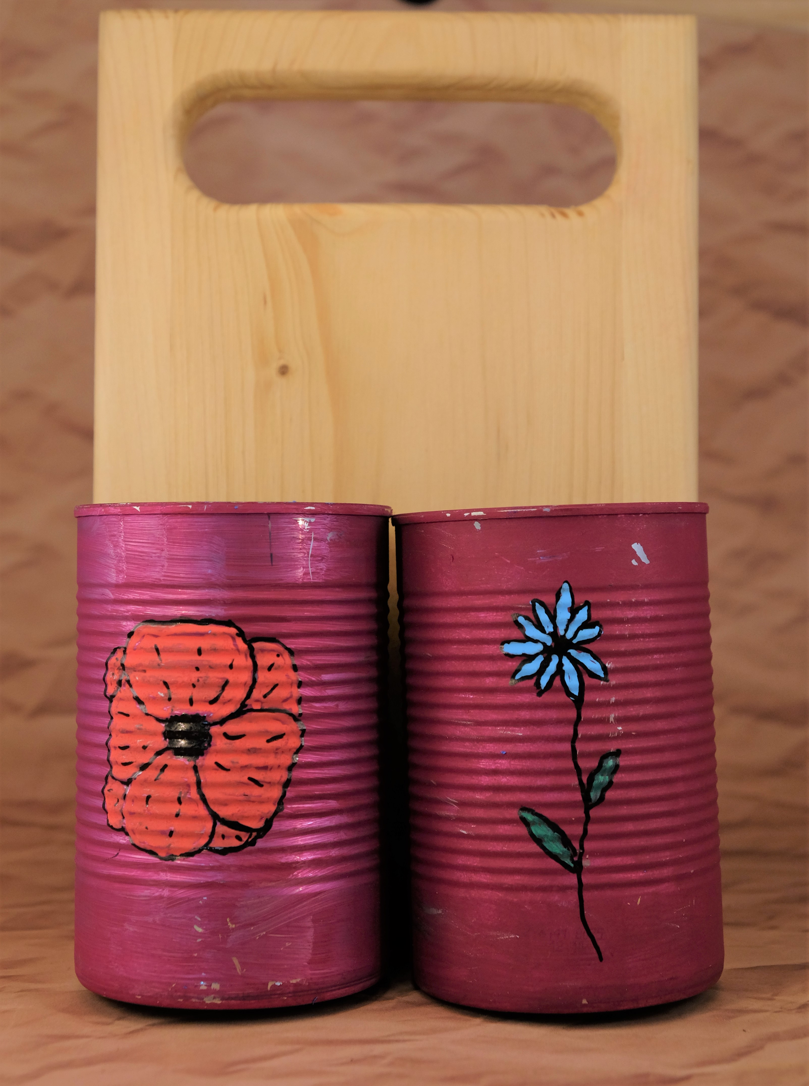Der Besteckhalter ist aus Konservendosen gebastelt und der Tragegriff aus Holz.